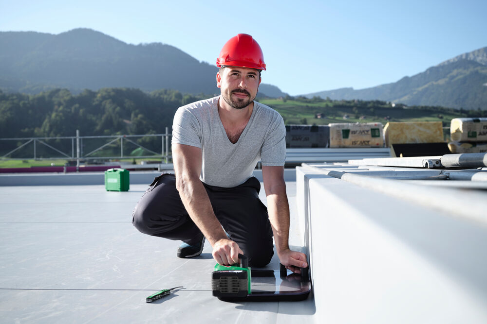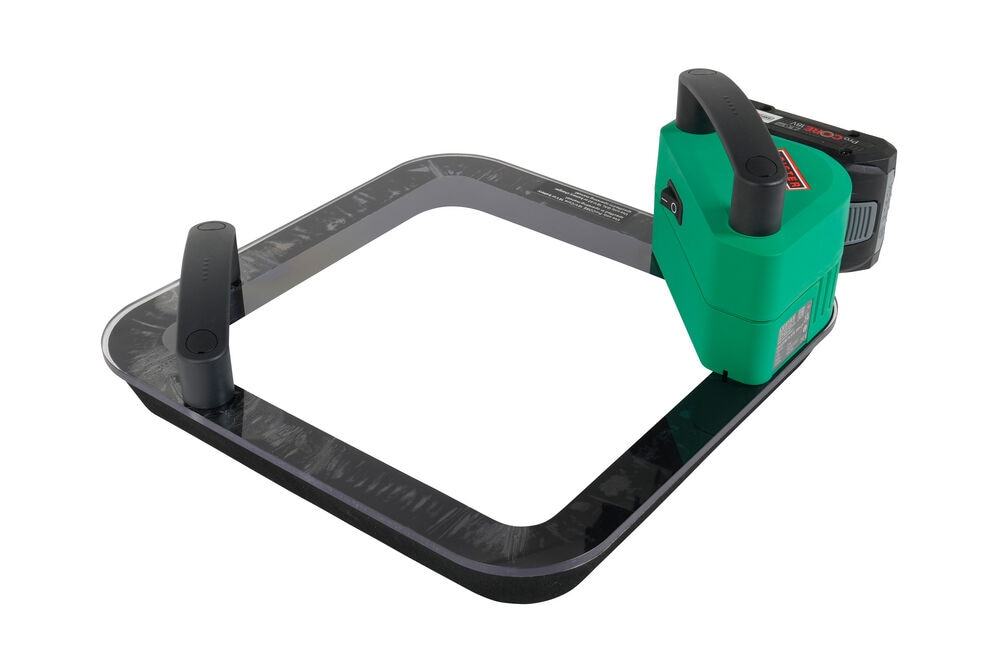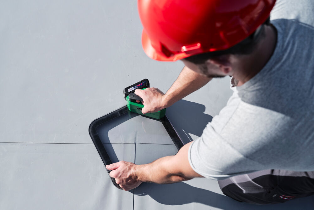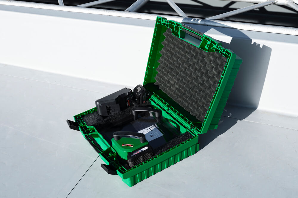 The VACUUM PLATE 100-LP from Leister is an easy-to-use, compact and cordless vacuum plate or vacuum bell jar for roofers and swimming pool builders. The universal AMPShare rechargeable battery (18 V) from Bosch with a 7-hour runtime ensures freedom of movement over long distances and immediate readiness for use of the vacuum testing device. Because the plastic plate, the pump and the battery are one unit, the vacuum test bell is compact, 2 kg light and can therefore be transported with one hand.