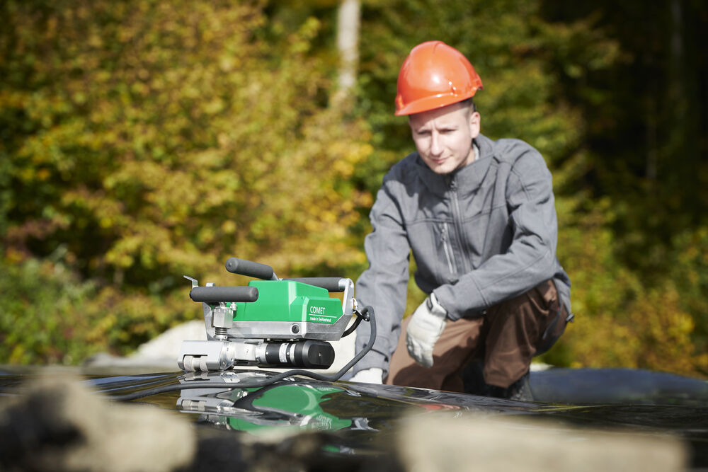 La soldadora de cuña caliente COMET 500 de Leister ofrece una comodidad práctica para soldar de forma fiable geomembranas gruesas y finas de termoplásticos como PE, HDPE y LDPE. Alcanza velocidades de hasta 8 m/min, sin necesidad de convertir la caja de cambios. La presión de soldadura necesaria se puede ajustar en la COMET 500 mediante un módulo de fuerza con un tornillo de ajuste, en función de la aplicación y/o del material. La cuña caliente se coloca automáticamente en el punto correcto del traslapo.
