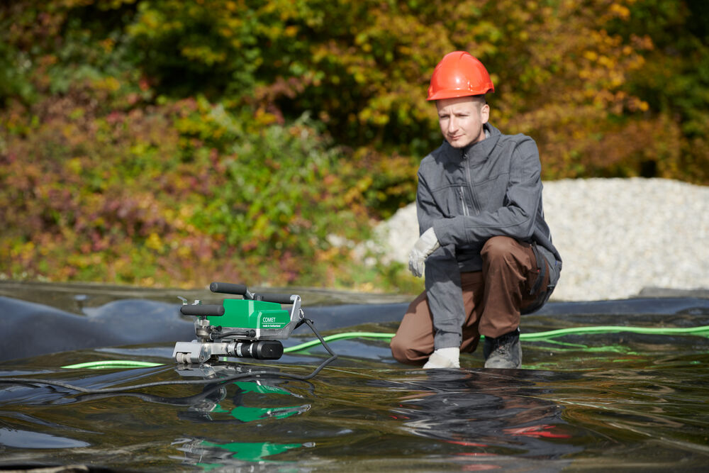 La máquina automática de soldadura de cuñas caliente COMET 700 de Leister ofrece todo lo que los usuarios de ingeniería civil desean cuando se trata de soldar por solapamiento geomembranas gruesas y finas de PE, HDPE y LDPE. Gracias al probado Leister Quality System (LQS), WIFI y GPS, el COMET 700 documenta los parámetros y coordenadas de la soldadura, lo que permite verificar la calidad de la misma. Gracias a LQS, los informes de soldadura necesarios se crean fácilmente en formato digital.