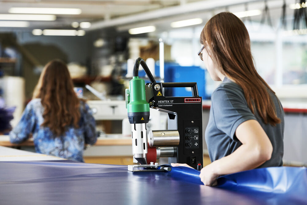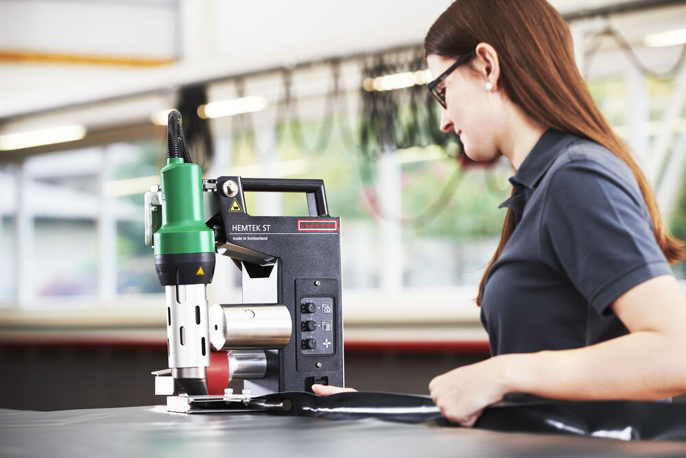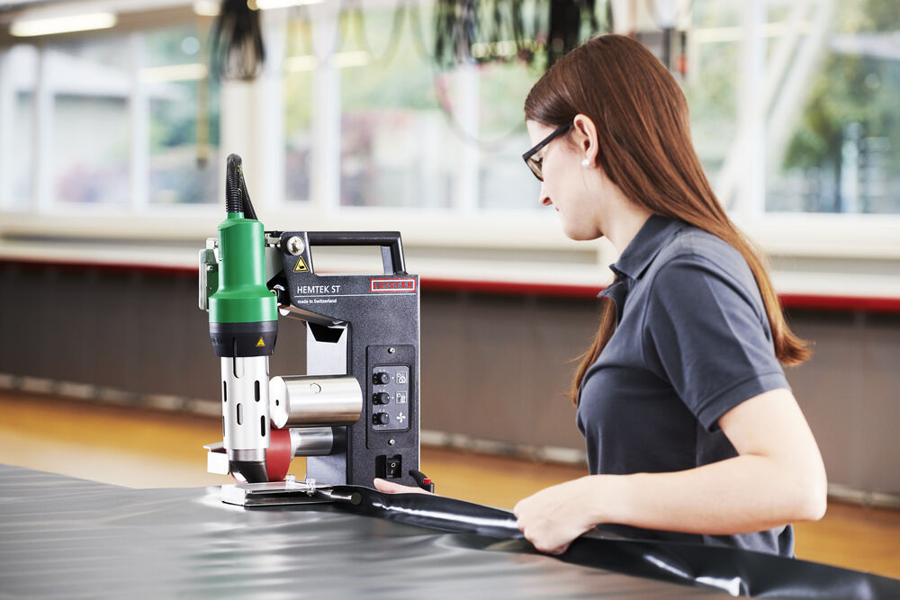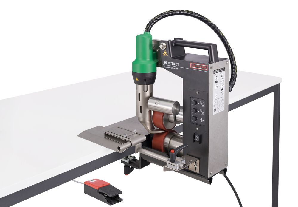 La eficiente máquina de soldar HEMTEK ST suelda dobladillos de principio a fin, ideal para pancartas y lonas de tamaño pequeño y mediano hechas de PVC, PE, PP y otros termoplásticos. Una guía de dobladillo ofrece tres aplicaciones: cerrada, 20/30/40 mm respectivamente 0,06/1,18/1,57 pulgadas, abierta hasta 100 mm / 3,9 pulgadas o con tubería.
