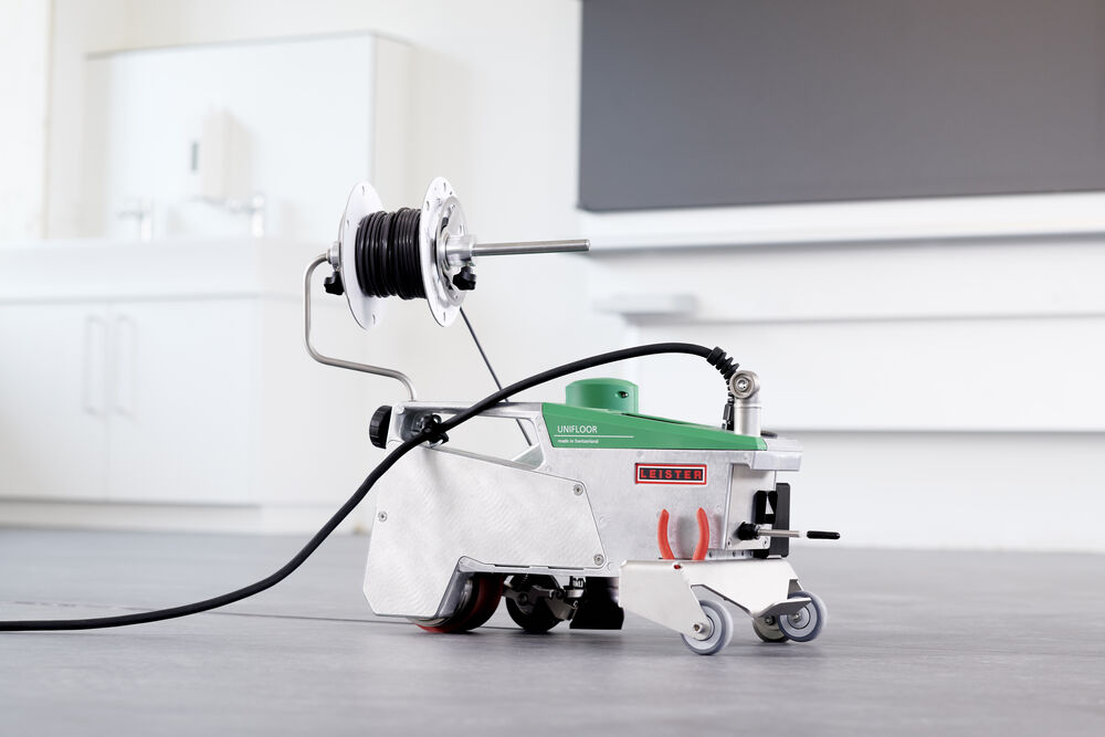 La soudeuse automatique de sol fiable de Leister, UNIFLOOR 500, est une version nouvelle et réimaginée des modèles UNIFLOOR E/S qui ont fait leurs preuves. Il convient pour souder les joints des revêtements de sol résilients en plastique tels que le PVC, le CV, le PUR, les sols antistatiques ESD, ainsi que pour sceller les joints des revêtements naturels en linoléum et en caoutchouc. Grâce à sa conception sophistiquée et au positionnement automatique des buses (ANP) développé par Leister, la soufflerie d'air chaud UNIFLOOR 500s peut être mise en marche et arrêtée automatiquement en appuyant sur le bouton de démarrage.