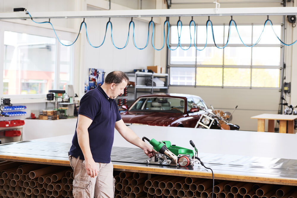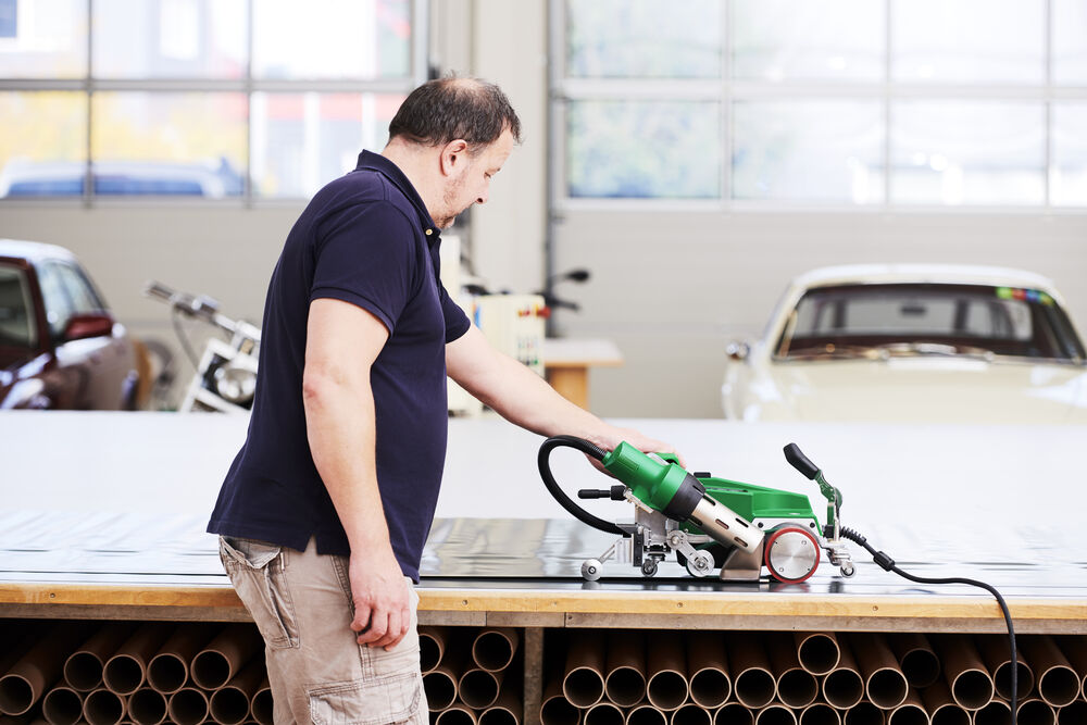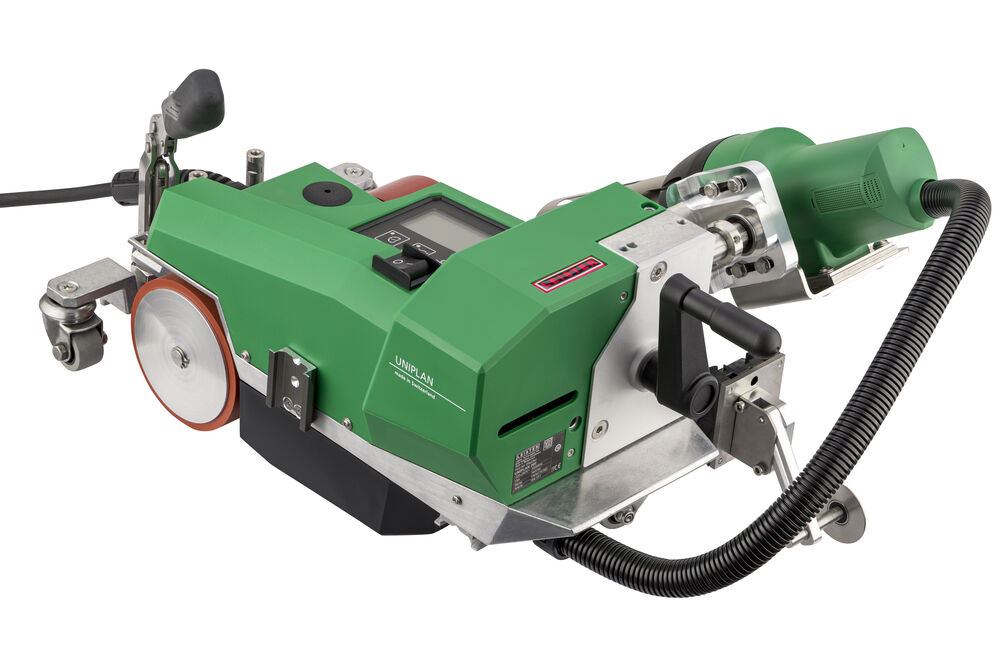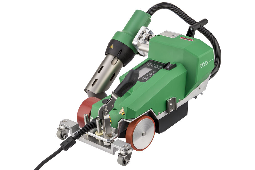 La soudeuse automatique UNIPLAN 300 est idéale pour le soudage par chevauchement, par ourlet et par tube. L'outil de soudure est facile à utiliser sur la table, ainsi qu'au sol. Le changement des guides de la soudure par chevauchement à la soudure par ourlet ou par tube est possible en une seule opération sur l'UNIPLAN 300 et l'UNIPLAN 500. L'engagement automatique de la buse en un seul mouvement offre un confort et une sécurité supplémentaires pour l'utilisateur.